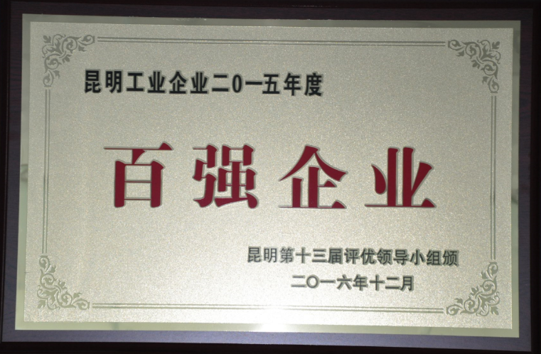 ??2016年12月23日,,,“昆明第十三届优异企业、优异企业家、昆明地区工业2015年度百强企业”表扬会在昆明市工人文化宫盛大举行。。。公司受邀出席聚会,,,并荣获“昆明第十三届优异企业”、“昆明地区工业2015年度百强企业”称呼。。。??